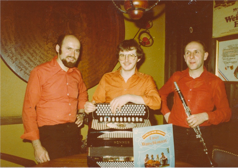 Meinrad ist 1945 geboren und in Beckenried aufgewachsen. Im Elternhaus befand sich ein Klavier und seine Mutter ermöglichte es ihm, als er achtjährig war, bei Frieda Wymann-Zelger den Klavierunterricht zu besuchen. Neben dem klassischen Unterricht legte Frau Wymann Wert auf das Zusammenspiel mit anderen Instrumenten und die Volksmusik. Meinrad fand besonders Gefallen an der Ländlermusik und sein Ziel war es, in einer Ländlerkapelle als Pianist mitzuspielen. Seine ersten Kapellenerfahrungen konnte er beim Beckenrieder Akkordeonisten "Tal-Sepp“, Sepp Käslin sammeln. Durch ihn sind dann auch Kontakte zu anderen Musikanten entstanden. Es war 1961, an dem damals bekannten Bettags Musikantentreffen im Gasthaus Wasserfall in Engelberg, wo Hans Aregger den jungen Meinrad fragte, ob er mit ihm in Reussbühl LU aufspielen würde. Es blieb dann nicht bei diesem einen Auftritt mit Hans Aregger. Hans war gerade dabei, nach der Auflösung der Kapelle Aregger-Roos, eine neue Formation zu gründen. So engagierte Hans für den nächsten Auftritt den damals sechzehnjährigen Meinrad als Klavierspieler. Das war dann der erste Auftritt mit der neu formierten Kapelle Hans Aregger, in der neben dem Kapellmeister Hans an der Klarinette und am Saxofon, Kurt Müller am Akkordeon, Sepp Bürkli am Kontrabass und Meinrad am Klavier mitspielten. Diese Formation bestritt schon im Jahre 1962 unglaubliche 140 Auftritte. In dieser Kapelle wirkte er bis 1965 mit. Ebenfalls anfangs der sechziger Jahre kam Meinrad durch Chaschbi Gander in Kontakt mit Dolfi Rogenmoser aus dem Ägerital. Schon bald wirkte er auch als Pianist beim bekannten Handorgelduo Betschart-Rogenmoser mit und konnte mit ihnen zusammen erste Schallplattenaufnahmen machen. Weitere Stationen von Meinrads Musikaktivität als Pianist waren die Kapelle Kurt Müller, Malters (1965-1968), die Kapelle Sepp Nussbaumer, Oberägeri (1969-1977), die Kapelle Alois Aregger-Remy Näpflin, Beckenried/Horw (1977-1985). > Bild dazu unten.